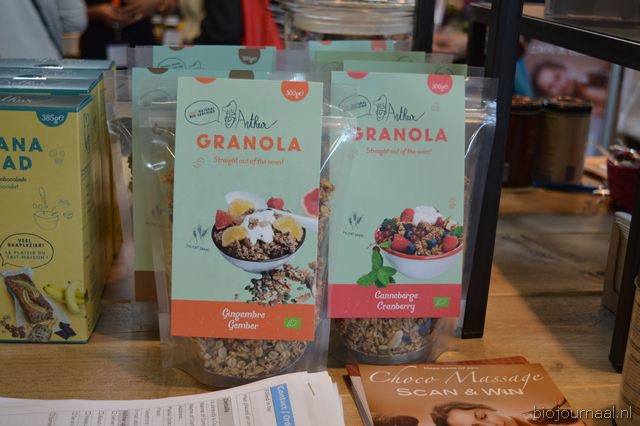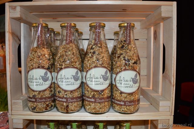 Mieke Bomans en Karen van Gompel met de drie soorten biologische home made granola's van Julia's Delicious World.