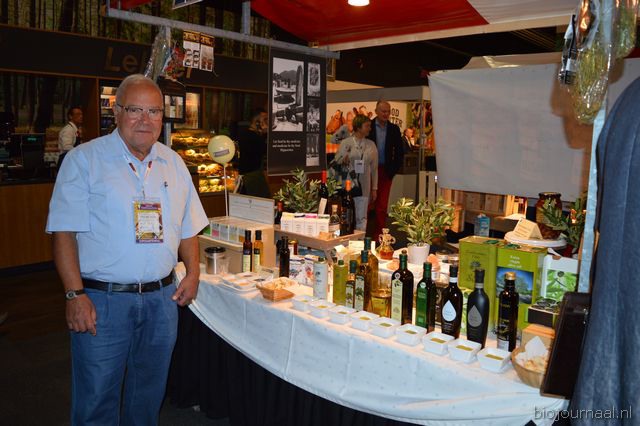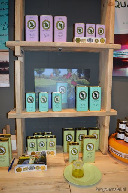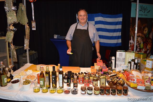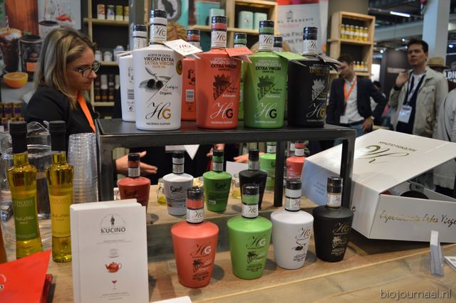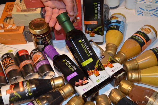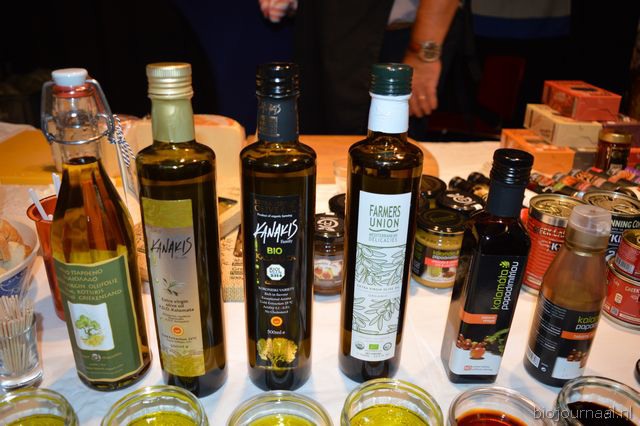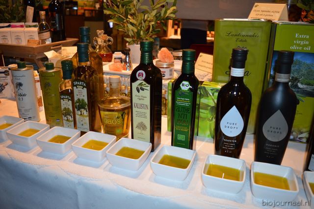 Nicos had ook diverse varianten biologische olijfolie bij.