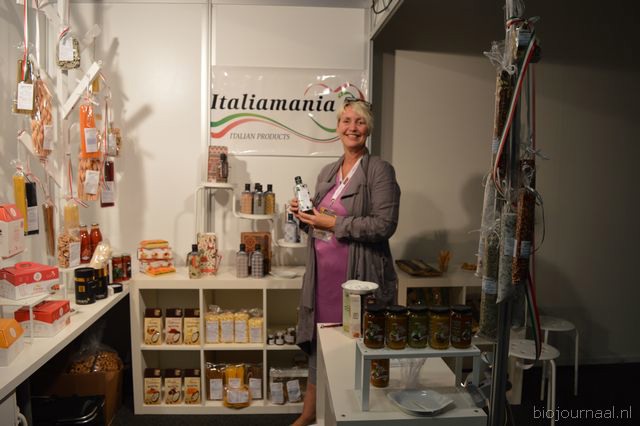 "Mirjam Violante met een biologische olijfolie van Italiamania. "Wij verhandelen allerlei ambachtelijke Italiaanse producten die met veel passie gemaakt zijn."