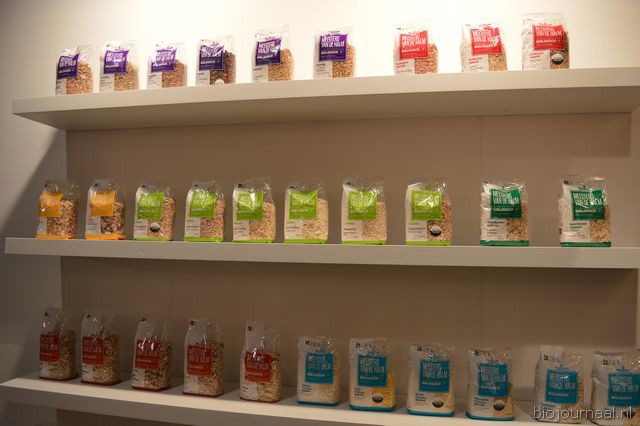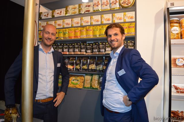 "Jelle de Jong en Mark Hake van Enrico met achter hen (middelste plank) de Amio-lijn. Deze lijn bestaat uit 9 verschillende biologische producten (peulvruchten). Jelle: "De producten zijn volledig traceerbaar tot aan de bron."