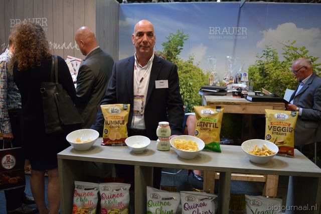 Francois van der Staal in de stand van Brauer. Voor hem liggen de biologische linzen-, hummus- en veggie-chips van het Engelse merk Eat Real.