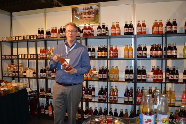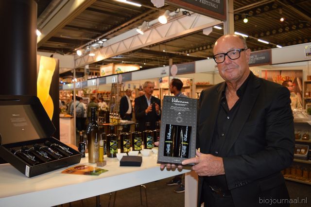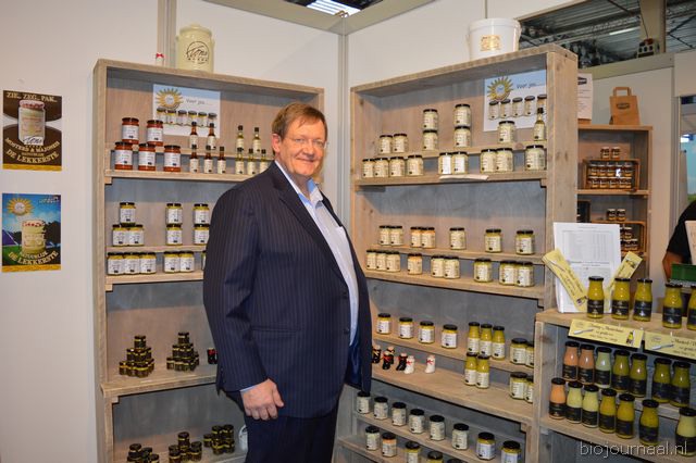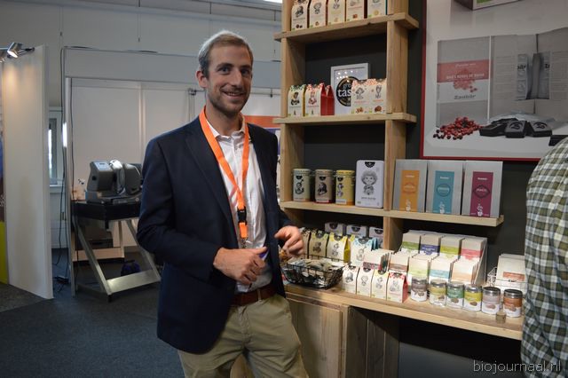 Rudy van den Berg van De Witte Eland met achter hem een biologische kruidenlijn en daaronder biologische amandelen uit Spanje.