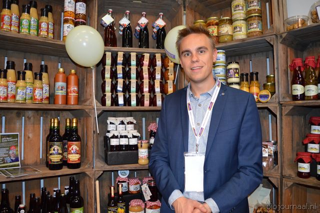 Bas-Jan Bax met naast hem de biologische jams en de biologische eierlikeur van Jan Bax - Ambachtelijke Voedselwaren.