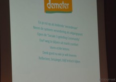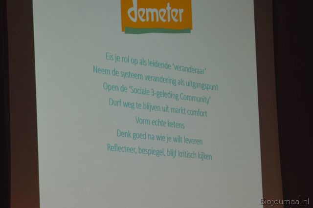 "De keuze is nu aan jullie: gaan jullie actief communiceren dat biologisch-dynamische landbouw veel en veel beter is dan gangbare landbouw of blijven jullie stilletjes hopen dat de consument uiteindelijk de keuze voor BD gaat maken. Blijf je bescheiden en marginaal of ga je voor verandering? Zoals Nelson Mandela zei: 'It always seems impossible until it's done'."