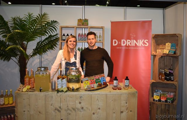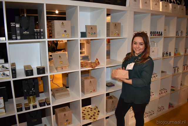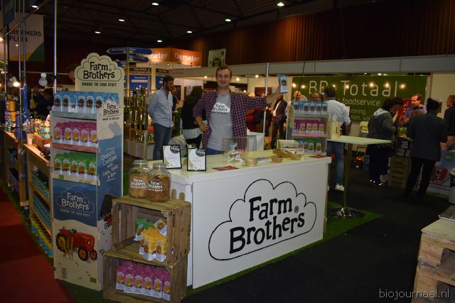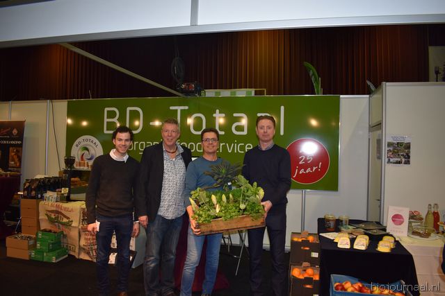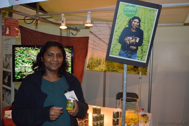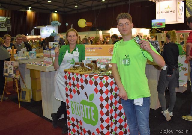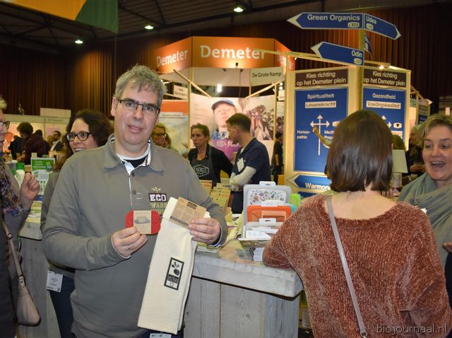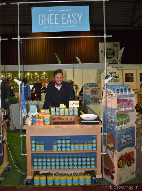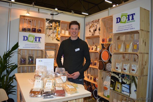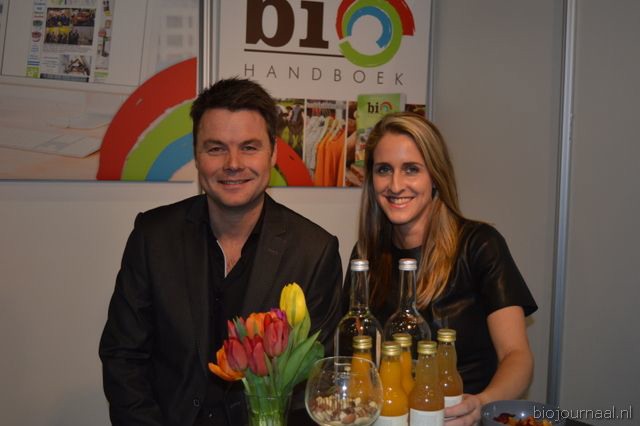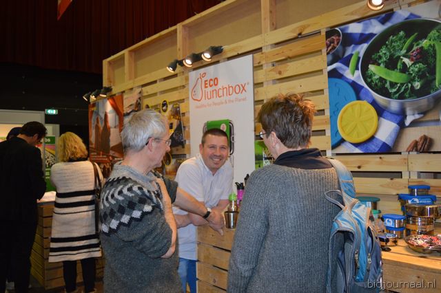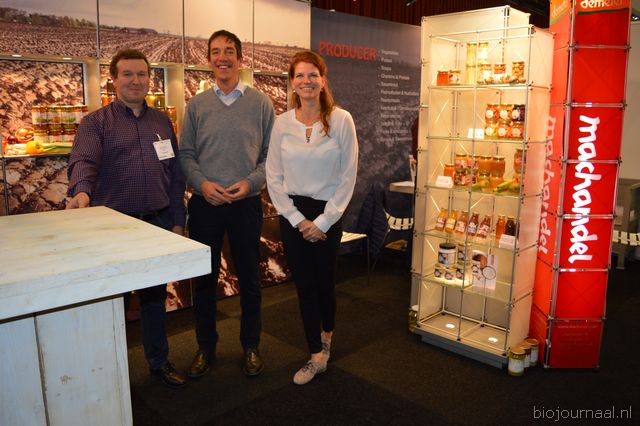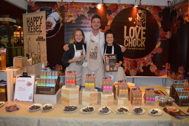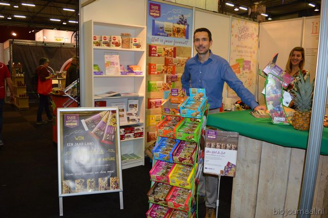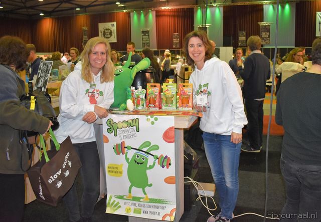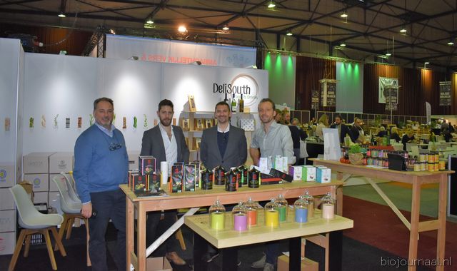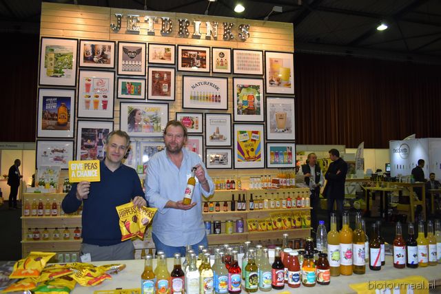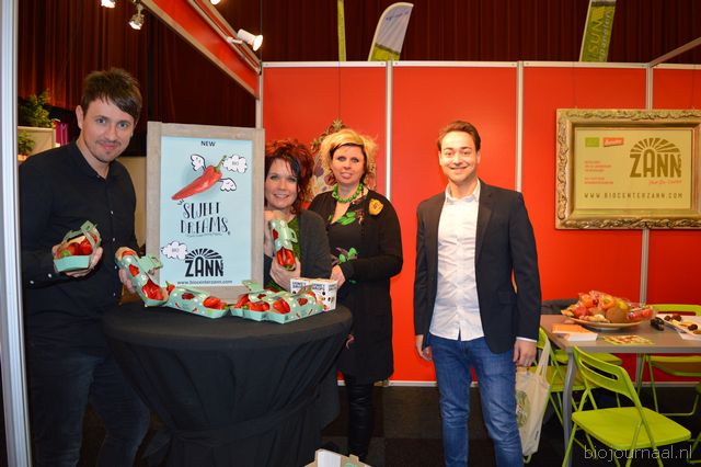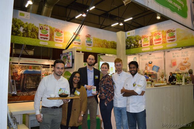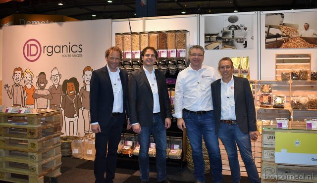 Herco Schoemaker, Sandy Vree, Rutger Bolten en Jetse Schokker van ID Organics laten de bezoekers hun nieuwe producten zien en proeven. Zo hebben ze cashewnoten in vlies uit Vietnam, borrelnootjes en wilde walnoten uit de oerbossen. Allen bio èn fairtrade.