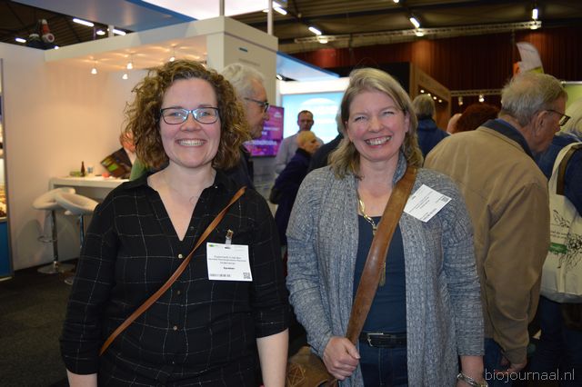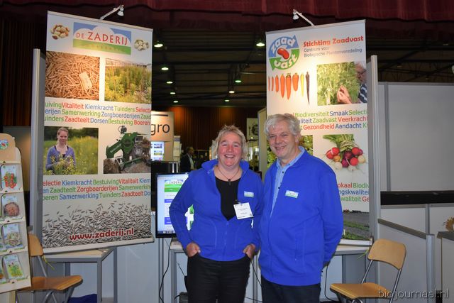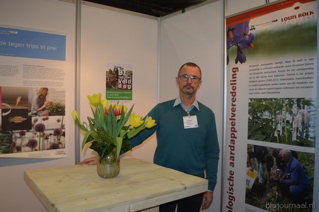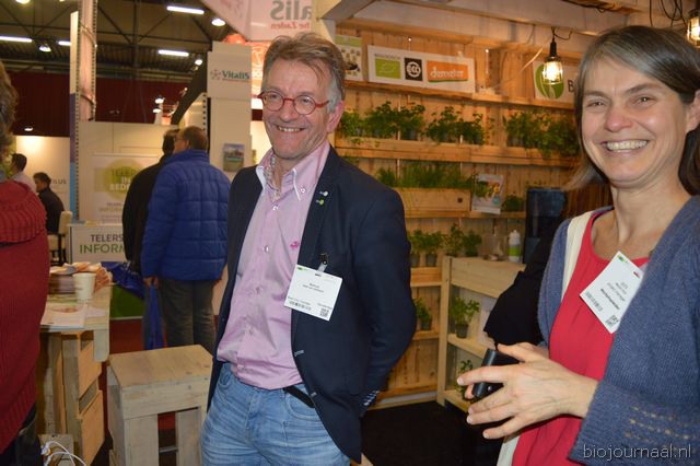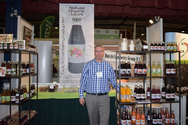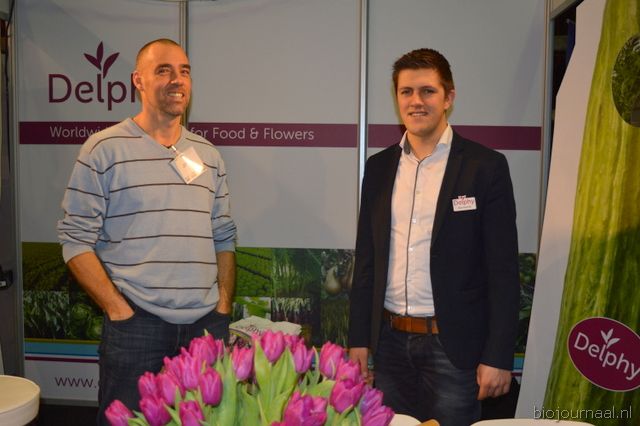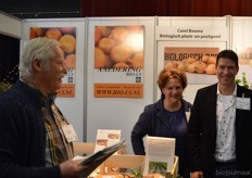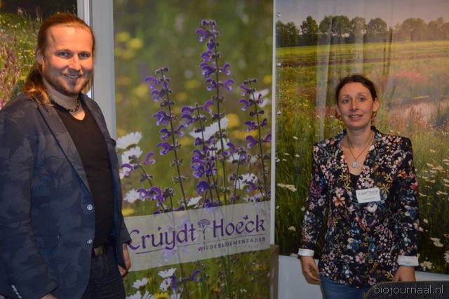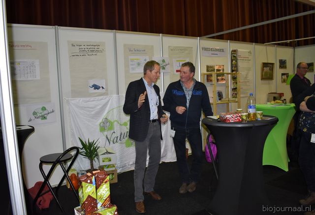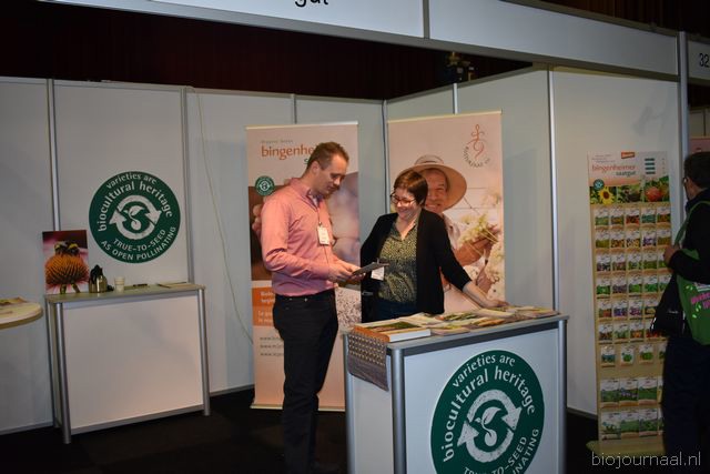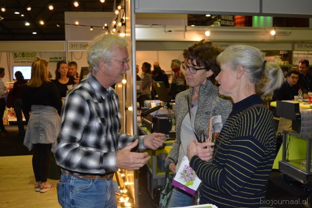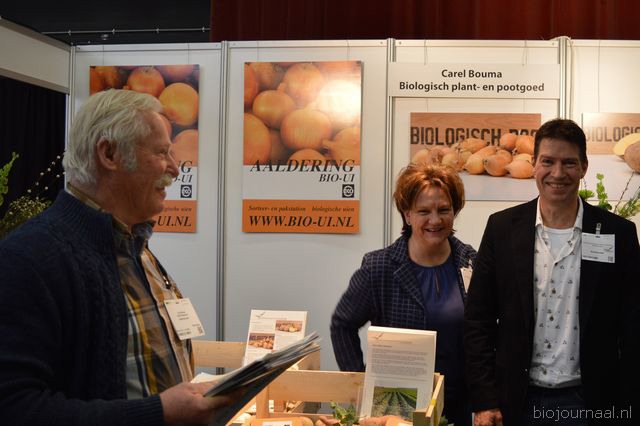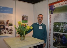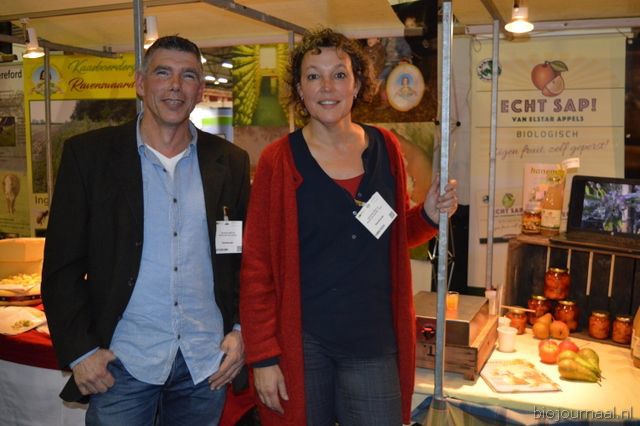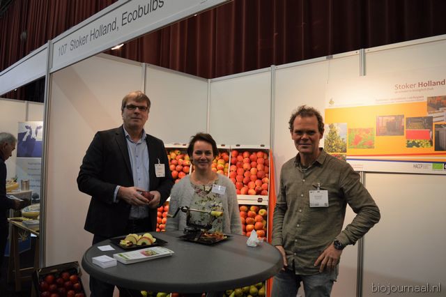 "Wim Stoker van Stoker Holland deelde zijn stand met Annelies Timmerman van Ecobulbs biologische bloembollen. Annelies: "Er is steeds meer vraag naar bio-bloembollen vanuit onder meer gemeenten en overheden. Zo heeft de SP in het noorden van het land onlangs een actie met het planten van bloembollen georganiseerd." Wim gaf aan dat het appelseizoen iets eerder klaar was, vanwege het mindere oogstjaar. Rechts Anton Oostveen van De Pruimenpot."