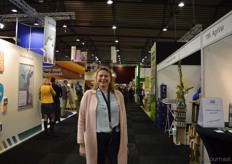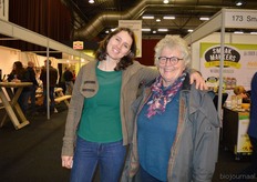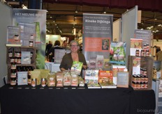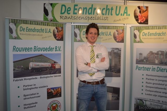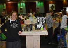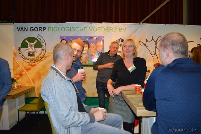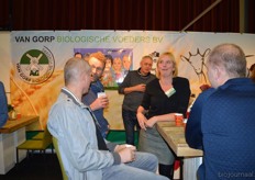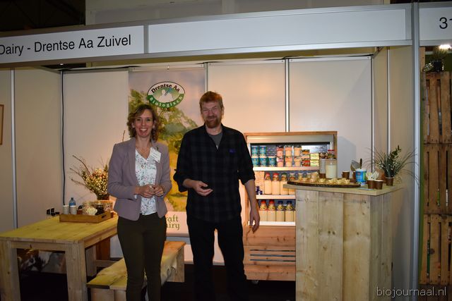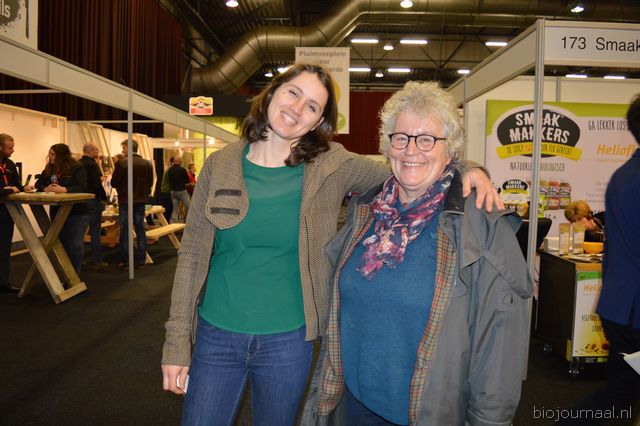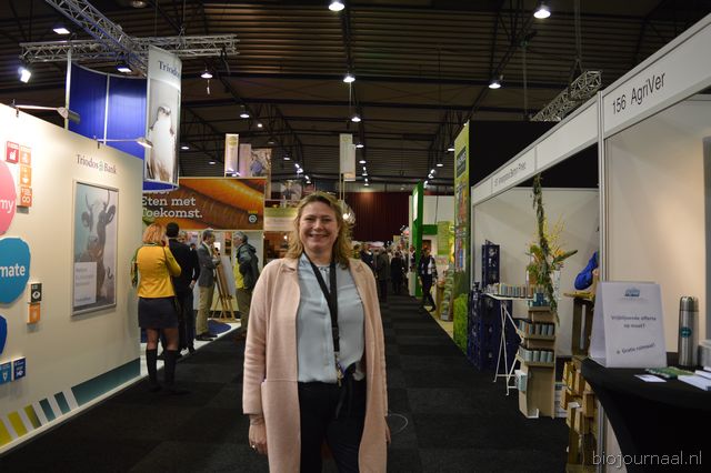 "Hanna Pluimes bij Van Gorp Biologische Voeders. Links naast haar (met beker in de hand) Arnoud van der Wijst. Hanna: "We hebben het weer erg naar ons zin. Deze beurs voelt als thuiskomen."