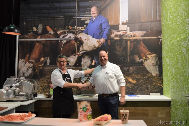 "Henk van Oers ziet dubbel bij Deli Harmony, met bio- boer René van Rijn in het groot en in 'real life'. Henk: "We zoeken nog meer bio-koeien voor onze vleesproductie."