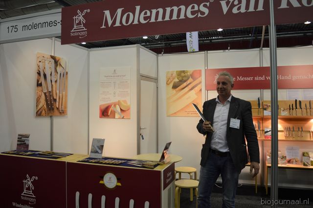 "Gérard Rinkes toont één van de messen uit het aanbod van Molenmes/Solingen. "We hebben echt een primeur: een schilmesje, gemaakt van bio-polymeer. De meeste andere schilmesjes zijn composteerbaar."