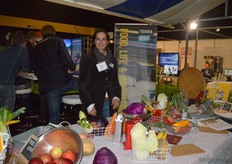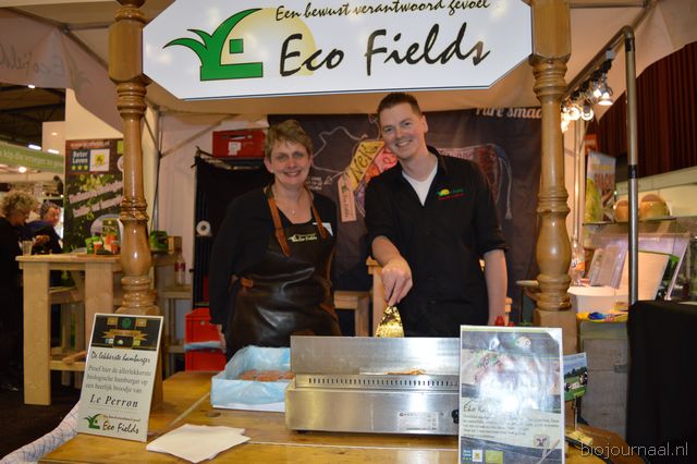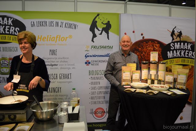 Nynke Louwes en Bouke Hoogstra presenteerden een gloednieuw product in de stand van Hoogpak BV & Smaakmakkers, namelijk: vegetarisch gehakt van Heliaflor (Organic Sunflower Products), een bio- proteïne vervaardigd uit zonnebloemen.