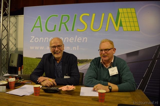 "John Ruiten (Agrisun) in gesprek met Bart Kooiker (De Schanshoeve). John: "Er zijn steeds meer bio- boerderijen met zonnepanelen. We staan hier voor de 7e of 8e keer en hebben al heel veel klanten op de Bio-beurs gevonden."