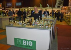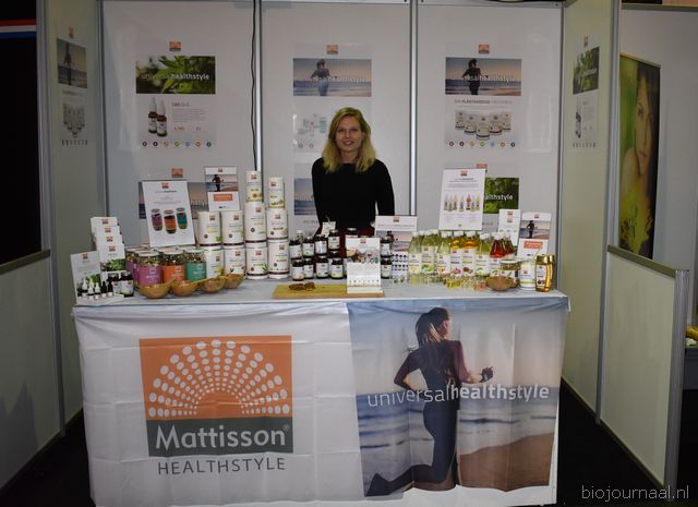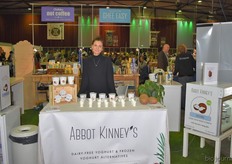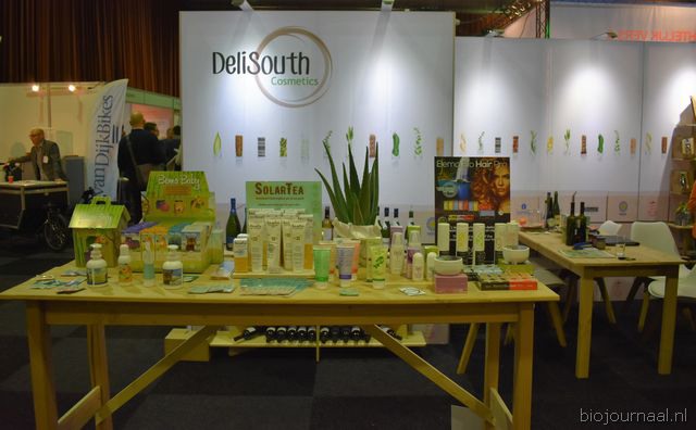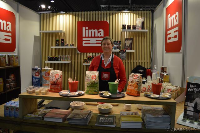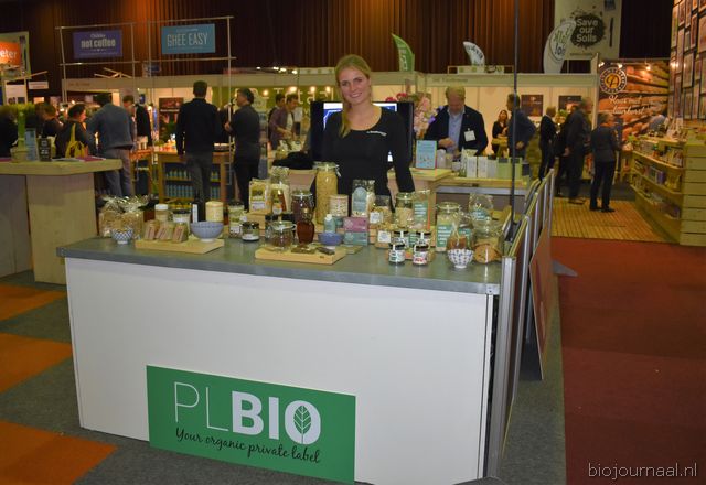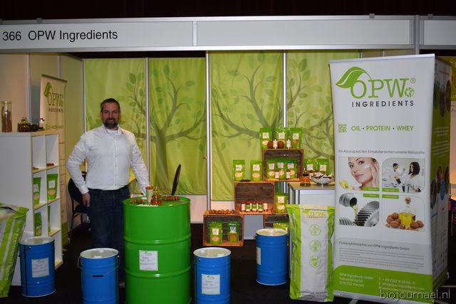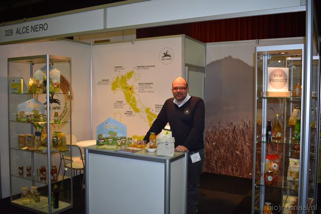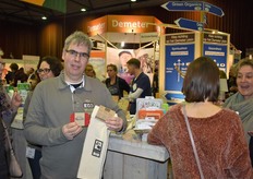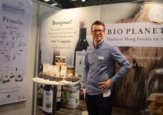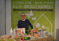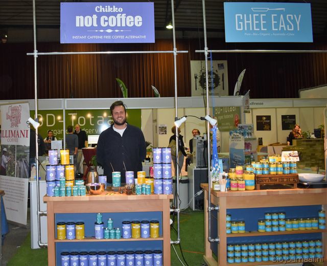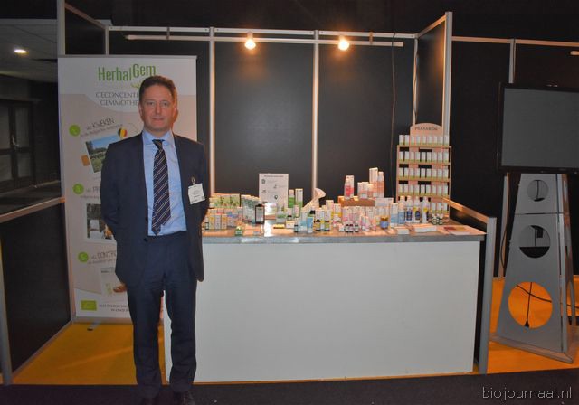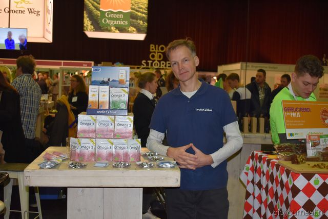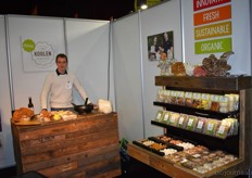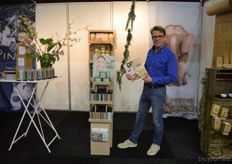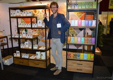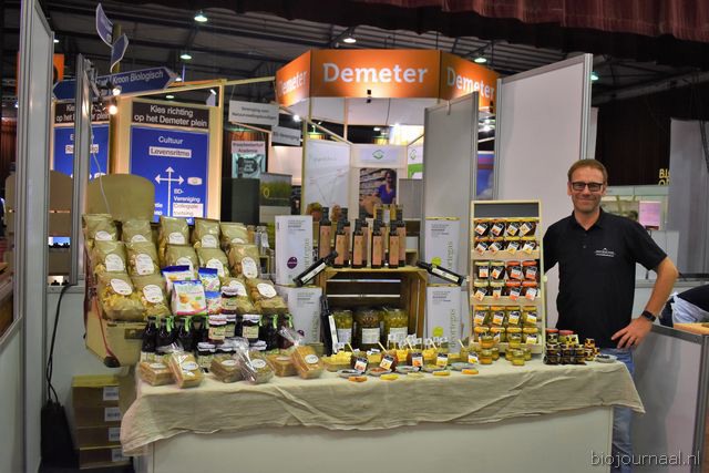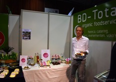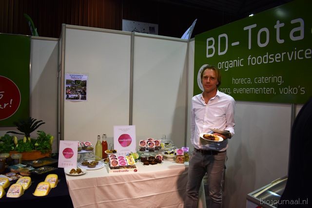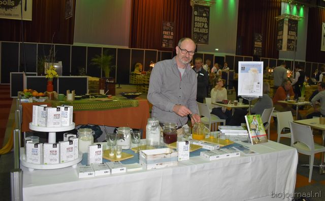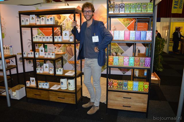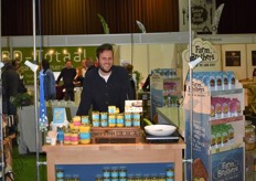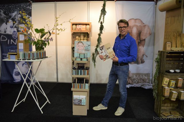 "Tim Spek van Noble House met onder meer de ORAC Botanico-mixen van Amanprana (links op de tafel) en rechts de seitan-producten van Bertyn. Tim: "Onze stand is een mooie etalage voor de producten. De Bio- beurs is een goede weerspiegeling van de Nederlandse bio-markt."