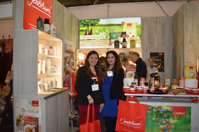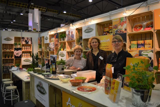 Martha Jeuken, Annemiek Flantua en Hester Prummel bij DO-IT. Achter hen producten van la BIO IDEA en Amaizin. Men kon proeven van de nieuwe rijstvellen van Amaizin.
