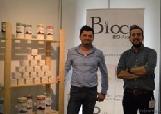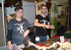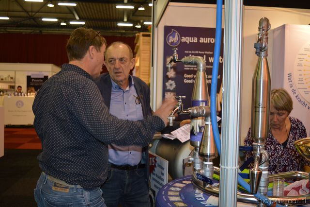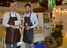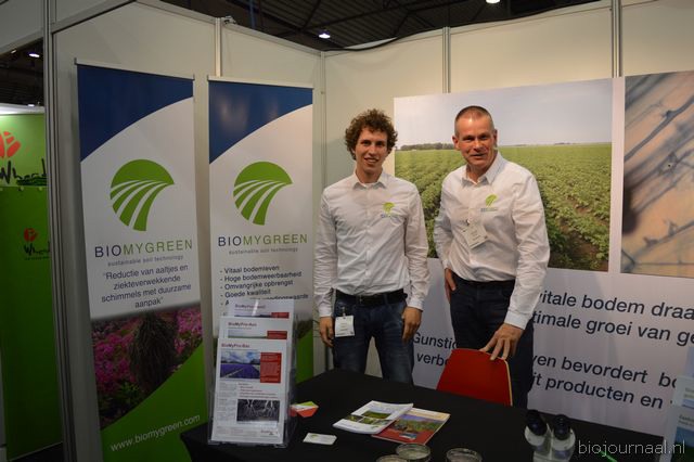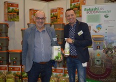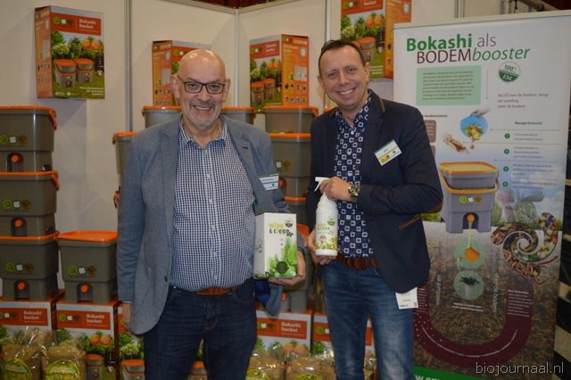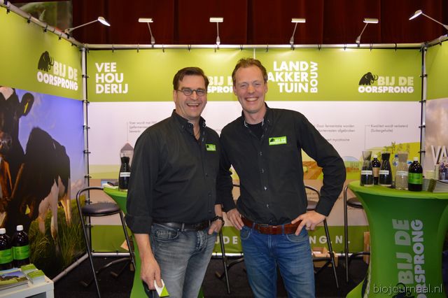 "Ger Kappert en Jasper ten Berge van Bij de Oorsprong. Dit bedrijf importeert micro-organismen en neemt de bedrijfsnaam erg letterlijk. Ger: "De micro- organismen hebben een regeneratieve werking in de bodem, mest en dergelijke. We hebben ook bokashi in ons assortiment."
