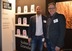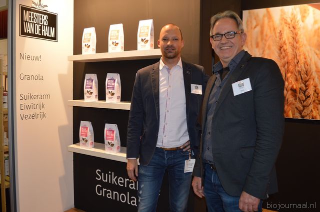 "Youri van der Heijden en Rob van den Berg met naast hen de gloednieuwe producten van Meesters van de Halm. Rob: "We presenteren op de Bio-beurs onze nieuwe range granola's. We spelen hiermee in op de trend rond gezondere producten. Deze granola is er in drie varianten: suikerarm, eiwitrijk en vezelrijk."