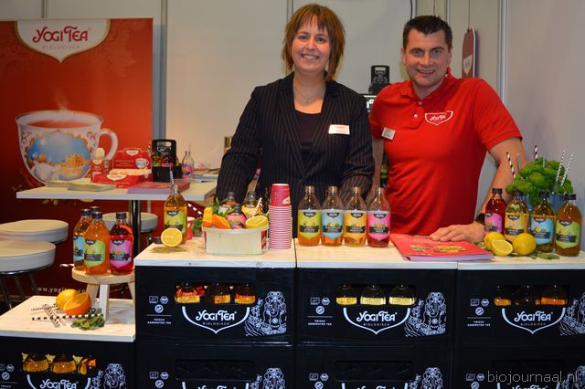 "Sofie Vanhove en Arthur Zwart bij Yogi Tea. Zij presenteerden een nieuwe toevoeging aan het biologische drankenschap (vanaf 1 maart leverbaar): een natuurlijke frisdrank, gemaakt van vers gezette kruiden- en specerijenthee. Er zijn vier varianten: Spearmint Leon, Hibiscus Mint, Mate Lemon en Orange Basil. Sofie: "De reacties zijn heel positief. Deze drankjes bevatten een beetje citroensap en agavesiroop voor natuurlijke houdbaarheid."