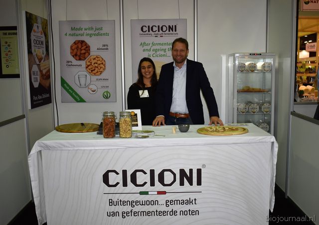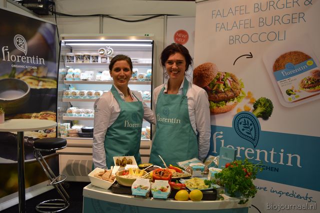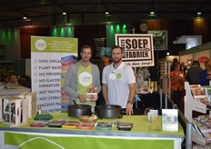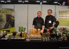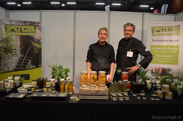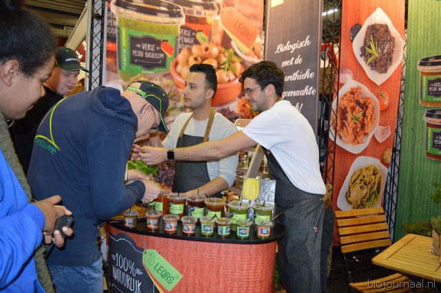 "Recep Koyuncuoglu en Ivo Noij laten proeven van de biologische pesto's en tapenades van LeQrs. Ivo: "We hebben een goede eerste beursdag gehad, er zijn wat retailpartijen langs geweest en veel ondernemers van bio-speciaalzaken."