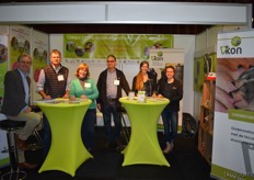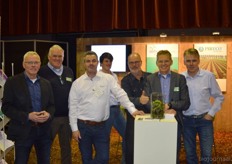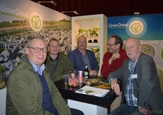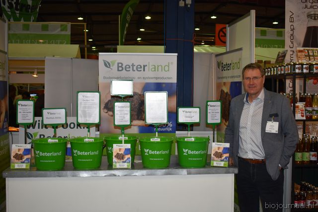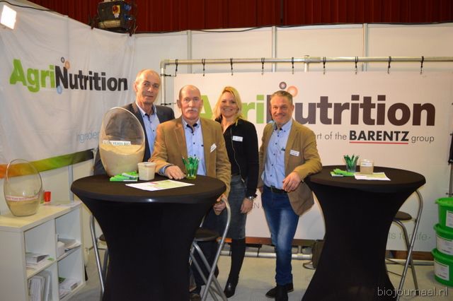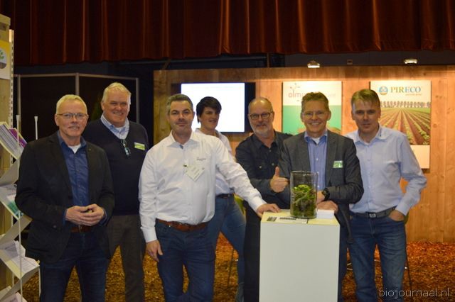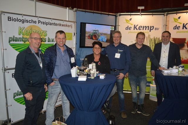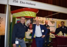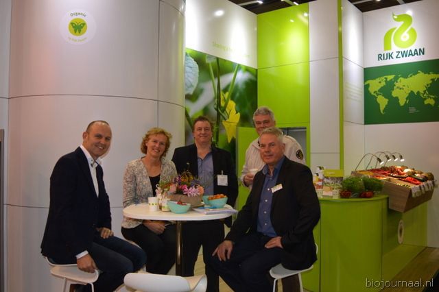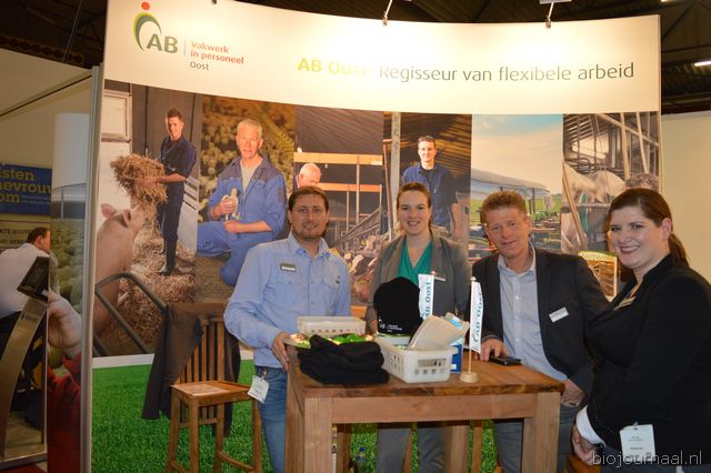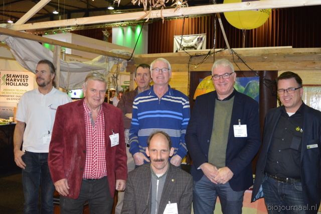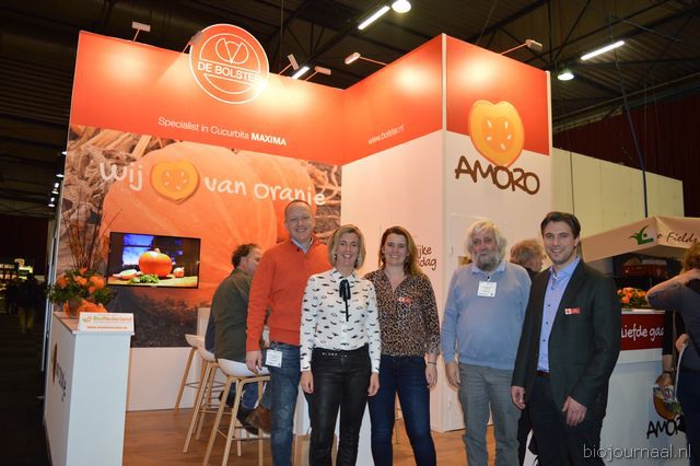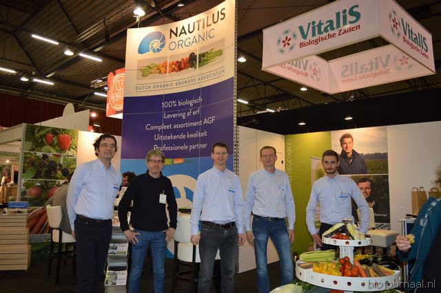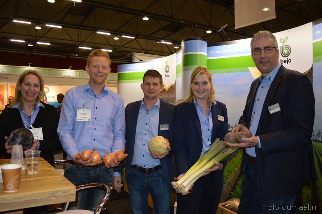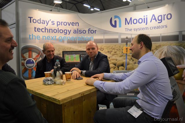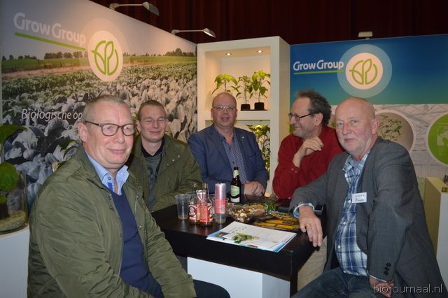 "Hein Wolff, Fons Verbeek (bio-teler), Erik Flux, Ammo Veerman en Dave de Bekker. Hein: "De eerste beursdag is heel goed verlopen. We hebben veel klanten, telers, omschakelaars en andere relaties gesproken."