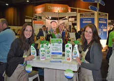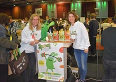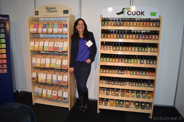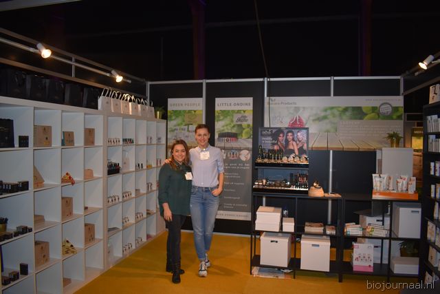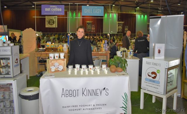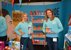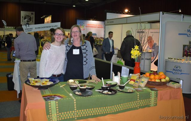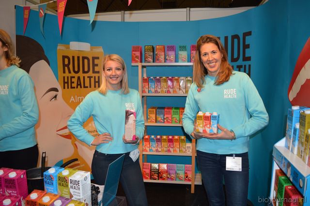 Rechts Karlijn Audenaerde van Rude Health (debutant op de Bio-beurs). Nieuw waren de kleinverpakkingen (250 milliliter) van de almond, hazelnut en coconut drink. En links de nieuwe Tigernut Drink, gemaakt op basis van aardamandel.