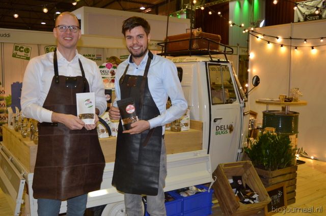 Berry Pleiter en Aad Burger van Delibugs, smakelijke eetbare insecten verwerkt in lollies, chocolade insecten in verpakking beschikbaar zoals bijvoorbeeld krekels, meelwormen en sprinkhanen. Zij zijn van origine een verpakkingsbedrijf maar hebben Delibugs als bedrijf overgenomen.