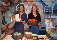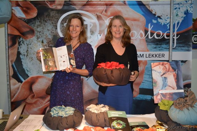 Iris van de Graaf toont het boek Langzaam Lekker, koken met de ecostoof en rechts Caro Niestijl met een ecostoof.