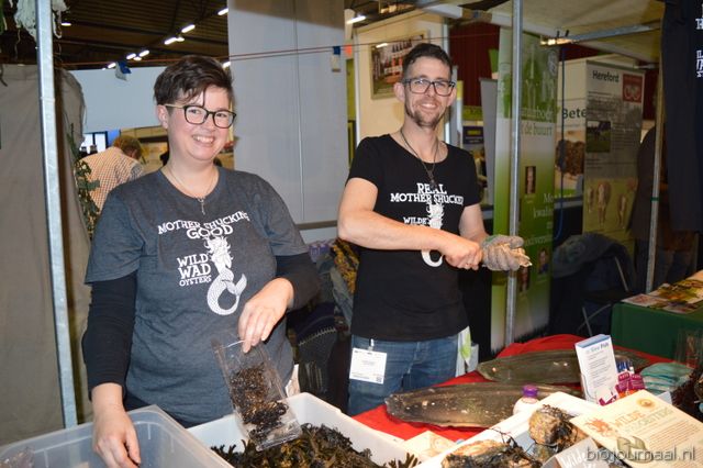 Marieke Pieters en Luke Schiferli van Goede Vissers, bezoekers konden er wilde oesters en zeewier proeven uit het Waddengebied.