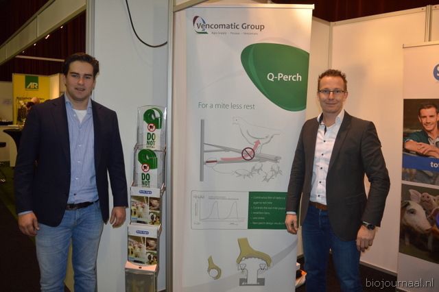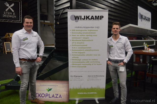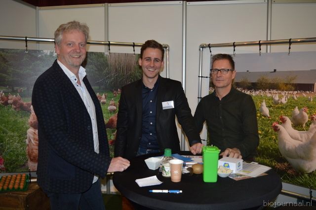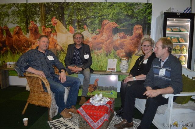 Wilfred Jonkman (rechts) in de stand van Reudink in gesprek met biologische pluimveehouders van VOF van Harten (Barneveld).