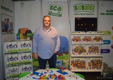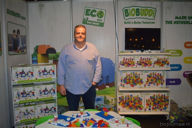 Er was veel animo voor de duploblokken van Biobuddi. Deze zijn gemaakt van afval van suikerriet (inclusief de kleurstof). Op de foto Steven van Bommel bij een greep uit het assortiment, binnenkort zijn ook dieren beschikbaar, nu voornamelijk alfabetische blokken en kleuren.