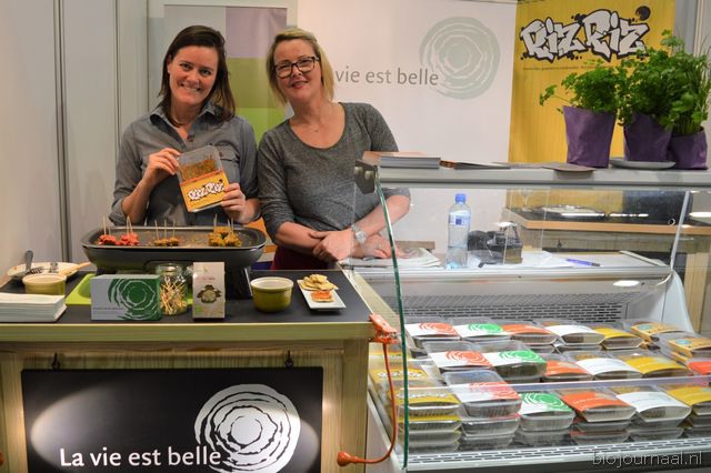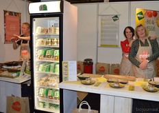 Eigenaresse Susanne de Raaij en stagiair (en tevens mede product ontwikkelaar) Rick Hettinga laten de mensen proeven van de 3 nieuwe smaken van Biobite. De nieuwe smaken zijn: Ras el Hanout, gember/citroen en sinaasappel/kaneel.