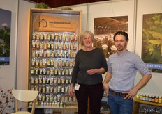 "Dennis van Teylingen en Eveline Renders (De Traay) met voor hen een deel van de vernieuwde verpakkingen van Bee Honest. Eveline: "We zetten hiermee in op betere herkenbaarheid."