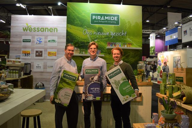 Wessanen presenteerde het nieuwe gezicht van Piramide. De gehele theelijn is in een nieuw jasje gestoken. Rob Persoon, Piet Honig en Erik Westeneng.