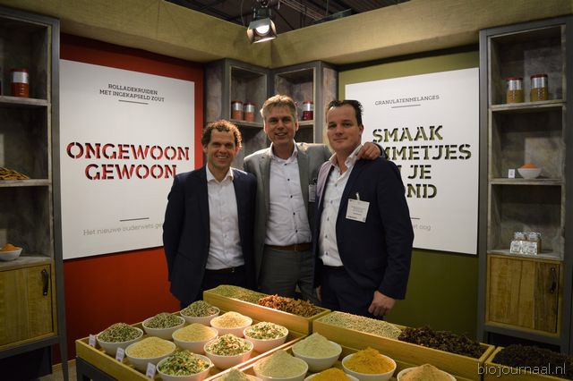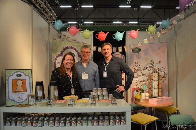 Organic Flavour Company gaf een sneak peek naar de nieuwe theevariant van Natural Temptation (Party Time). Nieuw is ook de 'My Golden Star'-variant op basis van kurkuma. Ook kon men proeven van de nieuwe kruidenmixen. Op de foto: Vendie Kroesbergen, Peter van de Steeg en Ronald Bakker.