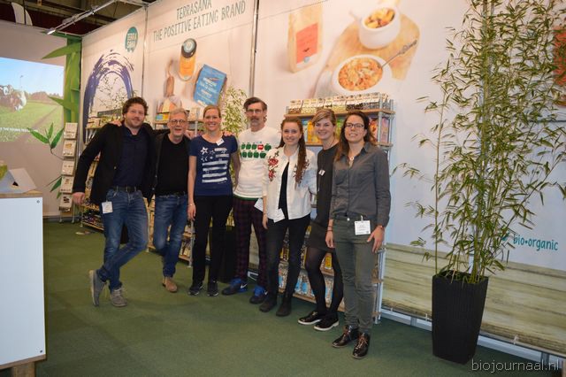 Bij TerraSana kon men van verschillende nieuwe producten proeven, waaronder de Triangles en de Choco Treats. Ook nieuw was de aubergine tapenade. Van links naar rechts: Olle Jacobs, Peter Jacobs, Belinda Barnhard, Aart Jansen, Roea Priem, Kirsten van der Linden en Sarah de Jong.