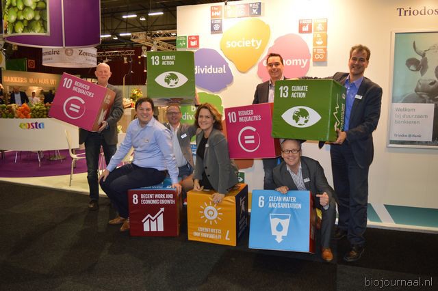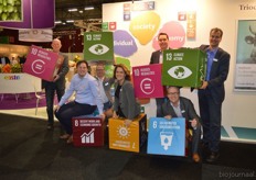 "Een deel van het team van Eosta met blokken die staan voor de Sustainable Development Goals. "Veel van deze doelen raken de bio-landbouw. We willen hiermee aangeven dat het belangrijk is om te investeren in bio-landbouw. We moeten met zijn allen naar een schonere en betere wereld", aldus Michaël Wilde. Van links naar rechts: Simon van Zanten, Gregory Serruys, Gunther de Vadder, Monique Mooij, Guido Hilhorst, Michaël Wilde en Gert Kögeler."