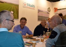 Marcel van Diemen (lachend in blauw overhemd) in een goed gesprek bij Vitalis Biologische Zaden.