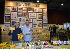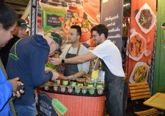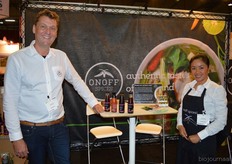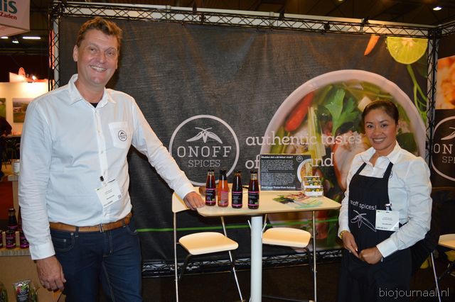 "Onno Stienen en Pantaree Pantitat met achter hen het nieuwe logo en de vernieuwde look van ONOFF SPICES. "We krijgen erg goede reacties hierop." Ook presenteerde Onoff Spices vier nieuwe producten: biologische Thaise vissaus, limoenblad, pittige Thaise som tam dressing en een frisse biologische zoetzure saus van de tamarinde peulvrucht."