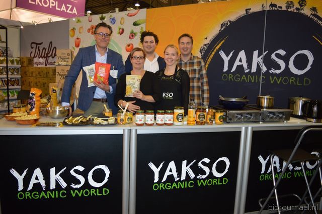 "Bjorn Andringa, Janet Nuyten-Sijtsema, Jelmer Daniels, Myrthe Sikma en Pieterjan Kok van FZ Organic Food. FZ had heel veel nieuwe producten bij, waaronder seroendeng en atjar tjampoer, mihoen en mienestjes van Yakso. Pieterjan: "Die eerste twee ontbraken nog in het natuurvoedingskanaal." Nieuw van Trafo (in composteerbare folie) zijn de linzenchips (Seasalt en Arabian Spice) en stone ground Tortillas."