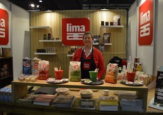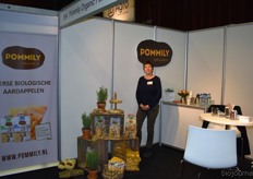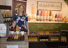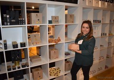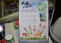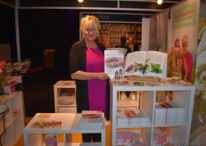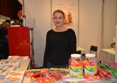 Kristel van Ammers van Corn Candies. Op de voorgrond nieuw in het assortiment: potten met biologische fruitlollies die los verkocht kunnen worden.