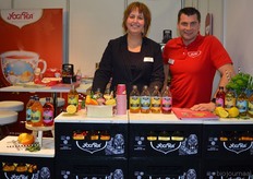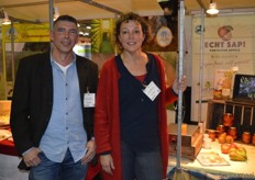 Toine Jansen en Jeanette Litjens van Haneman/Biofruit. Zij hebben een nieuwe loods met daarin een sapperslijn om nu naast conserven (stoofperen) eigen sap te persen.