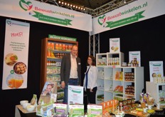 "Sander van Leeuwen (Schulp Vruchtensappen) kreeg Pieter Tent (Shelter Organics) op bezoek. Links op de foto zie je een bordje met daarop een welkomsttekst voor Koningin Maxima en wat wortelsap ('geniet van de worteltjes van oranje'). "We presenteren op deze beurs onze Krachtsappen, er zijn 8 varianten."