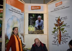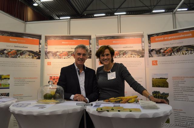 Michel Witmer en Joke de Geus van Groen Agro Control. Joke vertelde meer over de nieuwe afdeling binnen het bedrijf. Groen Agro Control investeert nu ook in grond- en gewasonderzoek in de akkerbouw, de vollegrondsgroenteteelt en de veehouderij. In een onlangs in Biojournaal verschenen artikel vertelde Michel al dat Groen Agro Control dit jaar gaat uitbreiden en buiten de landsgrenzen een lab zal starten.