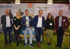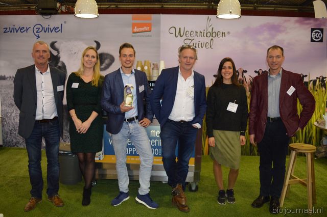 "Het Bio-beursteam van Weerribben Zuivel. Zij introduceerde tijdens de beurs A2 volle Jersey melk. Van links naar rechts: Wim Meure-Buren, Myrthe Bijl, Thijs en Klaas de Lange, Elena Allefs en Edwin Crombags. Myrthe: "We hebben heel veel enthousiaste reacties gekregen op onze A2 volle Jersey melk."