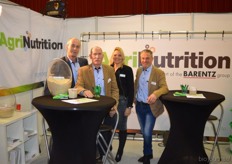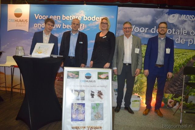 Aan de linkerkant Olivier Pals, René den Boer en Jelina Beens van Crehumus en aan de rechterkant Michiel Klappe en Etiënne van Regenmortel JadisAgri. Crehemus distributeren de producten van JadisAGri bv.