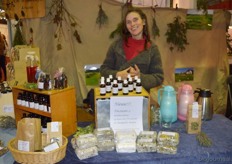 Marlies Engels van De Polderkol. Op de voorgrond de nieuwe tincturen van kruidenextracten op basis van 35% alcohol en biologische kruiden.