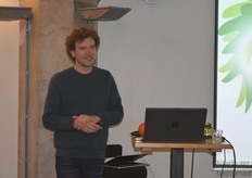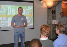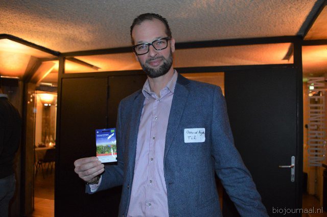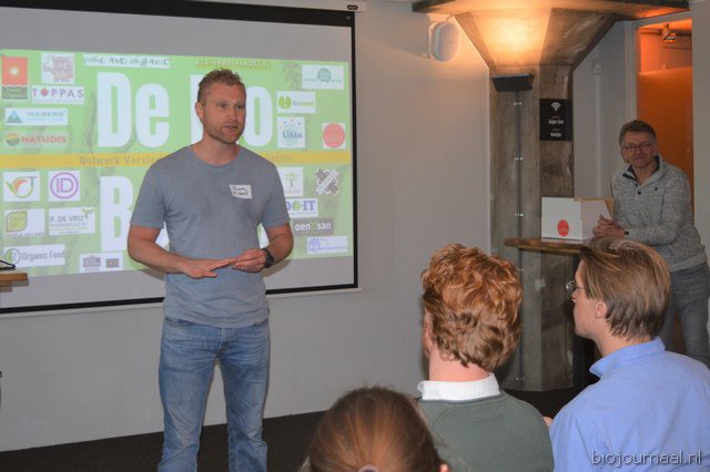 "Thomas van Hasselt heet alle aanwezigen welkom. Hij gaf aan dat er weer een vrij uiteenlopende set mensen op de BioBorrel afgekomen was. "De helft van de gezichten keert regelmatig terug, maar er zijn ook genoeg nieuwe deelnemers. Dat is natuurlijk erg interessant." Achter Thomas een overzicht van de Vrienden van de BioBorrel. Nieuw zijn: Meesters van De Halm, Yogi Tea en Royal Ingredients."