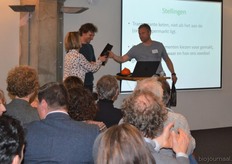 Als bedankje overhandigt Thomas een fles wijn aan de sprekers.