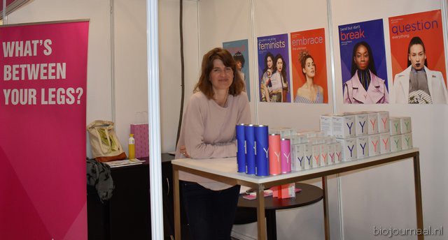 Mariah Mansvelt Beck vertegenwoordige Yoni tijdens de beurs in Londen. Zij creëren bewustwording voor de vrouwen met de slogan 'What's between your legs?'.