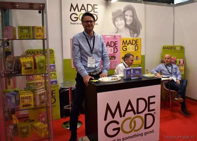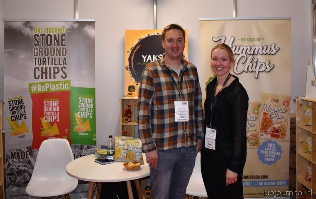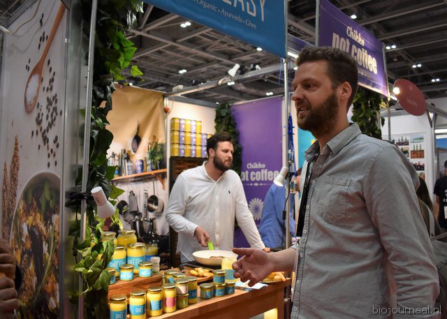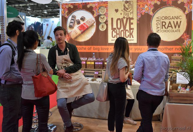 FZ Organic Food was voor de vierde keer aanwezig tijdens de beurs in Londen. Op de foto: Pieterjan Kok en de jarige Myrthe Sikma.