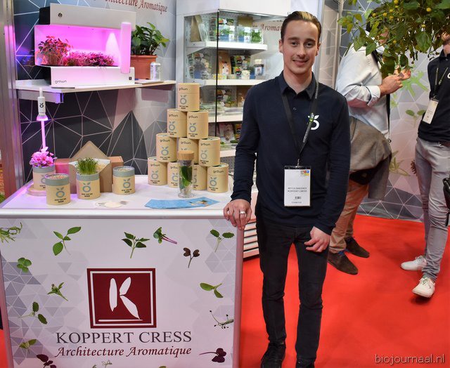 Mitch Smeekes vertelt enthousiast over het bedrijf Grown. Ze staan in de stand samen met Koppert Kress welke de zaden levert voor de kress producten van Grown. Ze zijn (nog) niet Skal gecertificeerd.