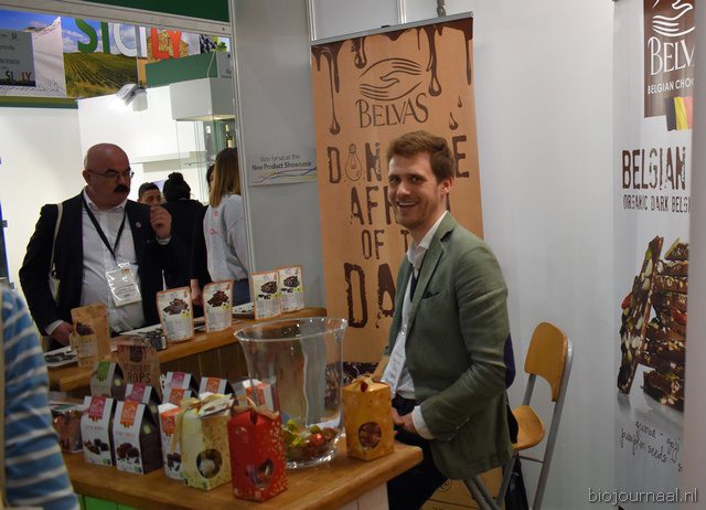 Gaëtan de Briey van het Belgische bedrijf Belvas trakteerde de bezoekers op een stuk chocolade of truffel.